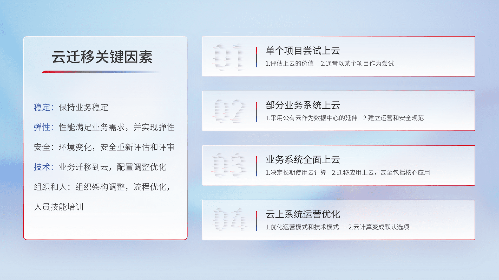 结合实际业务,,,从规划设计、、、、云平台选型、、云原生改造、、、数据迁移、、集成交付,,,,迁移全过程为客户识别最佳上云路径,,做好风险识别管理,,设计网络架构、、、、身份权限、、、安全审计合规、、、操作审计、、、日志审计、、、、监控告警策略、、、、多站点容灾设计等,,,对云上基础设施进行整体规划,,提升IT治理水平,,,以满足弹性、、、、高可用、、高性能的需求。。。。