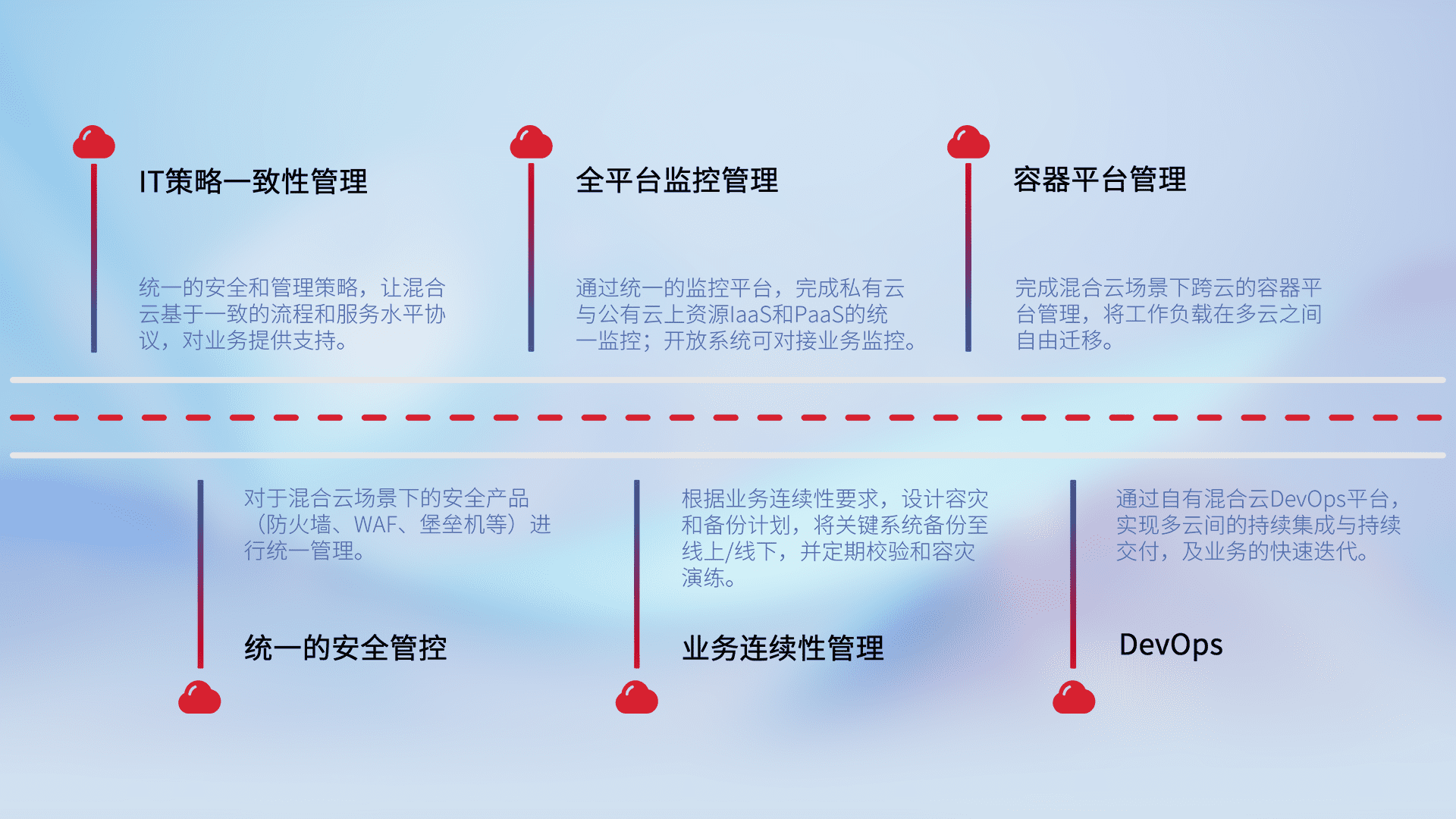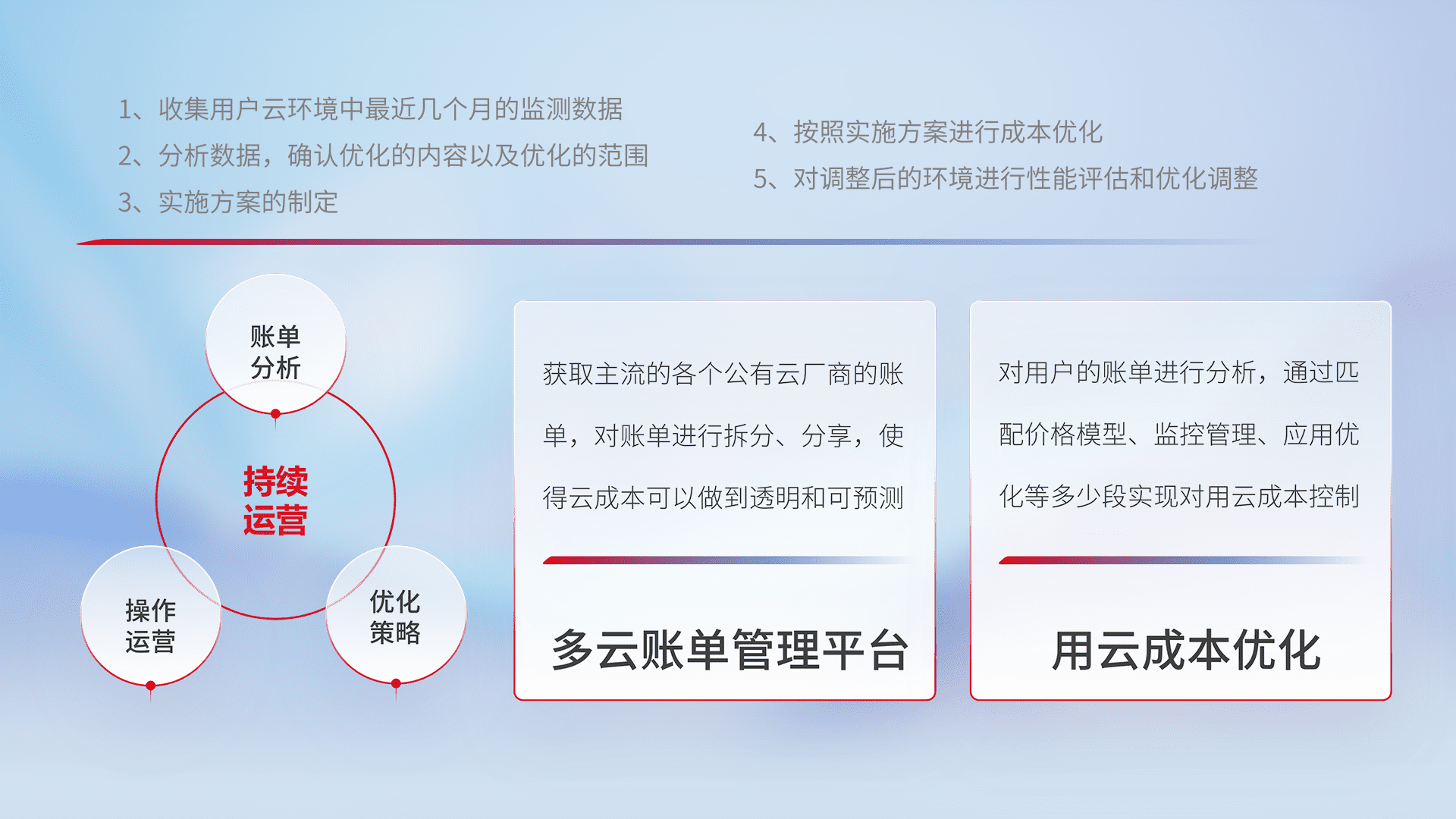通过多云纳管,,,以统一的资源数据模型把客户的云资源进行抽象和封装,,进而实现对多云资源的统一操作,,,保障云资源管理的可靠性、、、稳定性与可用性。。量身定制化运维内容,,配置、、开发运维、、补丁管理、、、、备份、、、监控、、、、认证和访问管理、、审计和日常巡检等,,保障在用云过程中的可靠度,,,稳定度以及高可用率。。。。