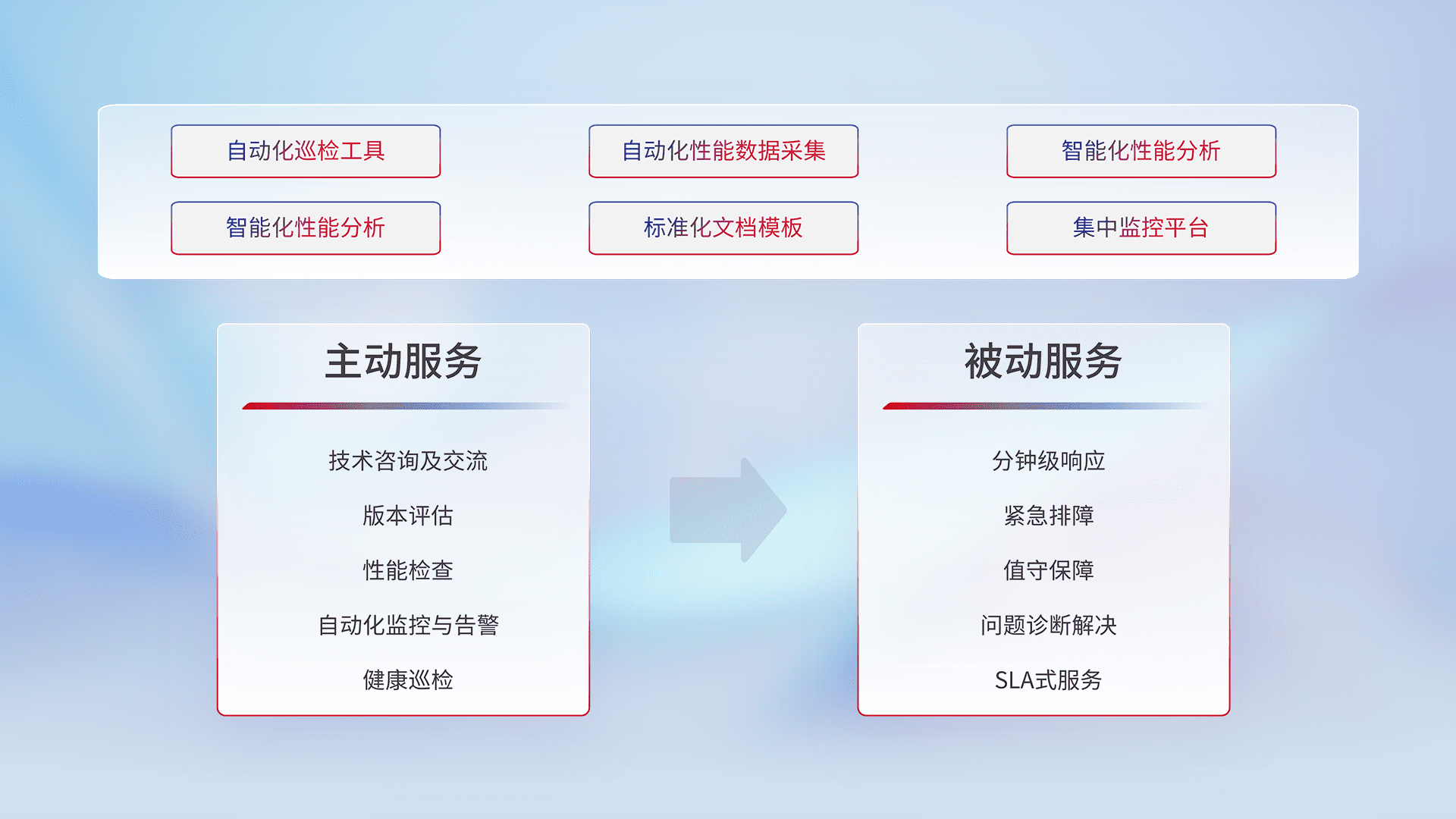 智能化工具和标准化文档,,保障服务质量,,提供主动服务(包含技术咨询、、、版本评估、、性能检查、、自动化监控与告警、、、健康巡检)和被动服务包含(分钟级响应、、、、紧急排障、、值守保障、、、问题诊断解决、、SLA服务)。。。