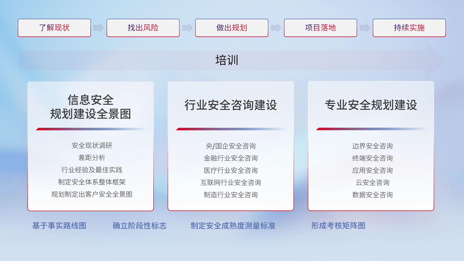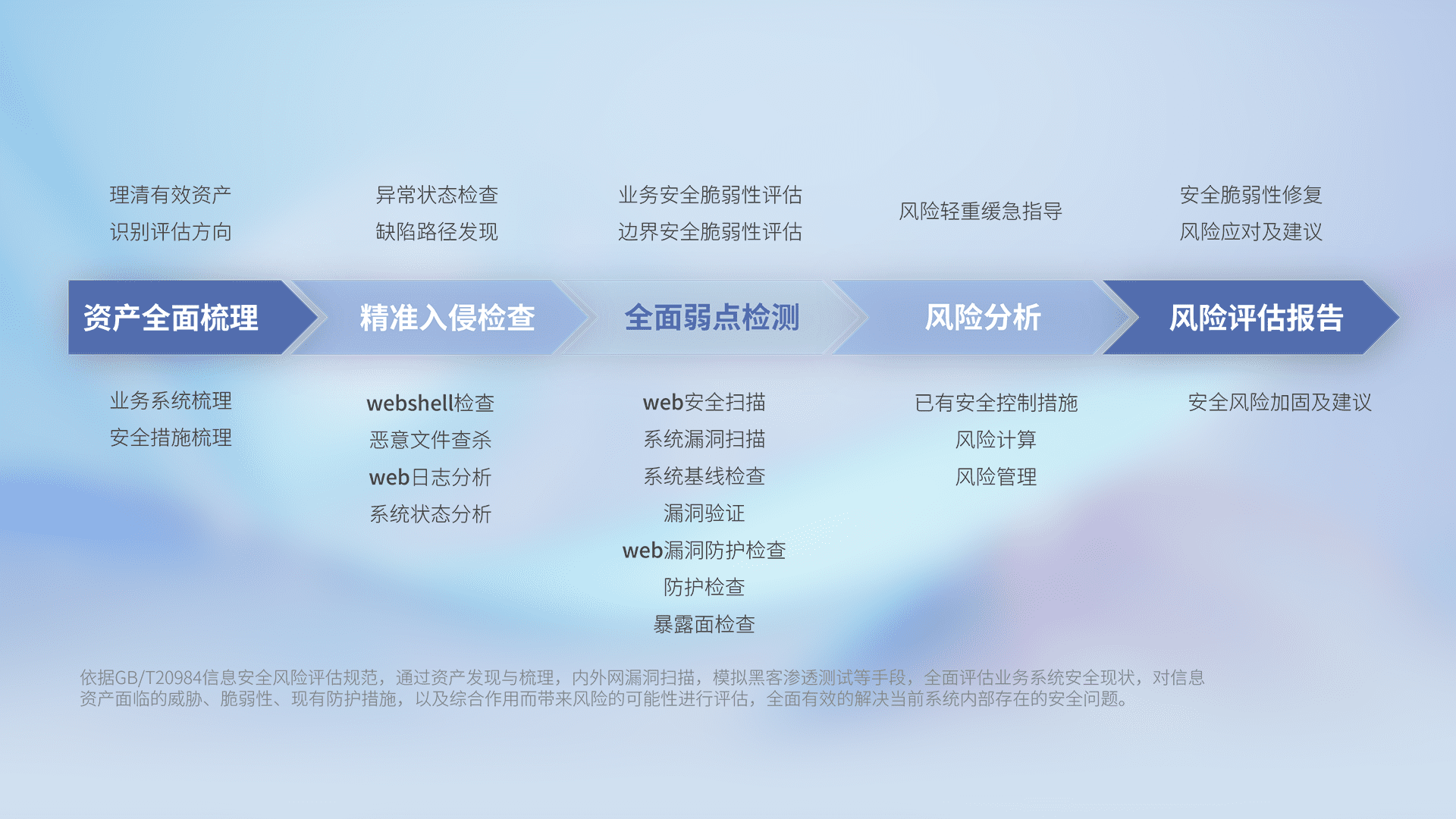 针对客户行业特性,,以专业的安全服务+多厂商联合解决方案提供专属的一站式安全管理服务,,,帮助客户全面感知网络空间威胁,,,,基于识别、、检测、、分析、、防护、、、监测、、响应的服务理论模型,,,从方案咨询、、集成交付、、、评估验证、、、、优化加固、、、、运维运营,,,,致力于为客户提供完整的闭环管理式安全服务。。。以实战经验为客户打造高抵御风险的安全体系,,帮助客户发现威胁、、对抗威胁、、、处置威胁,,,,不断积累安全对抗能力,,持续保障数字化安全。。